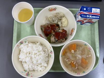 14日は、ご飯、牛乳、鮭のお茶オニオンマヨネーズ焼き、青菜のおひたし、みそ汁、みかんでした。新宮小6年生が考えた給食、地域の食材がたくさん使った献立で、全校みんなで美味しく食べました。